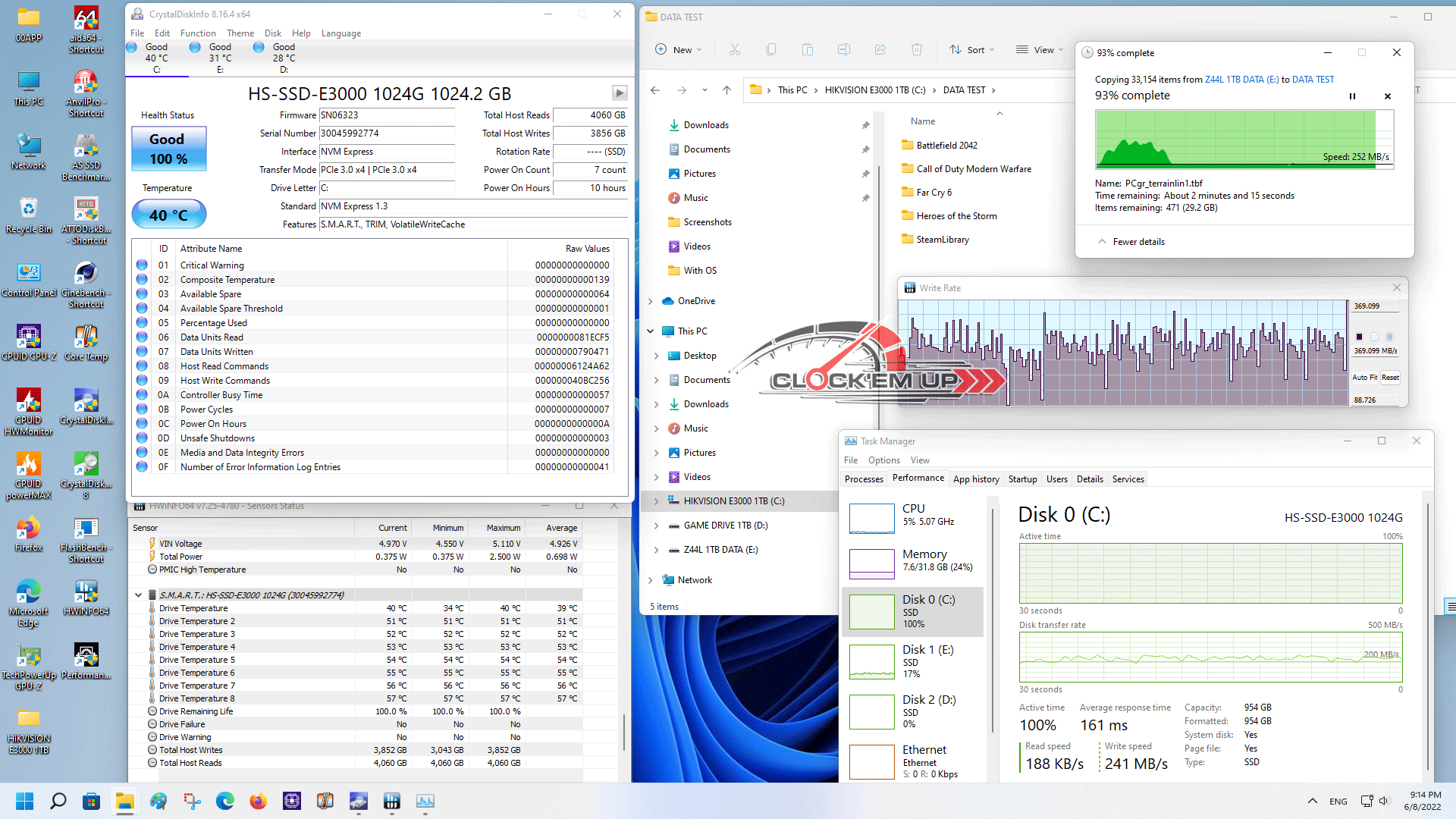 ผลการทดสอบททางด้านอุณหภูมินั้น จากที่ผมคอยสังเกตุดูอุณหภูมิการทำงานของเจ้า M.2 จากทาง HIKVISION E3000 ขนาด 1TB ตัวนี้ที่ติดตั้ง Heatsink M.2 ของเมนบอร์ดที่แถมมาให้เรียบร้อยแล้ว โดยช่วง Idle หรืออยู่เฉยๆ ไม่มีงาน อุณหภูมิจะจะนิ่งๆ ในระดับ 36c โดยประมาณ และเมื่อสั่งงานเขียน หรือ Copt ไฟล์เกมต่างๆ ลงในตัว SSD ลูกนี้ก็จะพบว่าอุณหภูมิสูงสุดที่เห็นคือจะอยู่ที่ประมาณ 40c ซึ่งผมก็ไม่เห็นร้อนเกินกว่านี้แล้ว อ้างอิงที่ห้องแอร์อุณหภูมิประมาณ 25-27c แบบ Open case นะครับ ส่วนเรื่องของความเร็วในการเขียนนั้น พอ SLC Cache หมดก็จะลดช้าลงเหลือแต่ความเร็วของเม็ด 3D-TLC NAND โดยเฉลี่ยความเร็วที่ผมสังเกตุเห็นคือ 250-280MB/s ครับ อันนี้ในกรณีที่สั่ง Copy ไฟเยอะๆ ระดับ 485GB ในความเดียวกัน