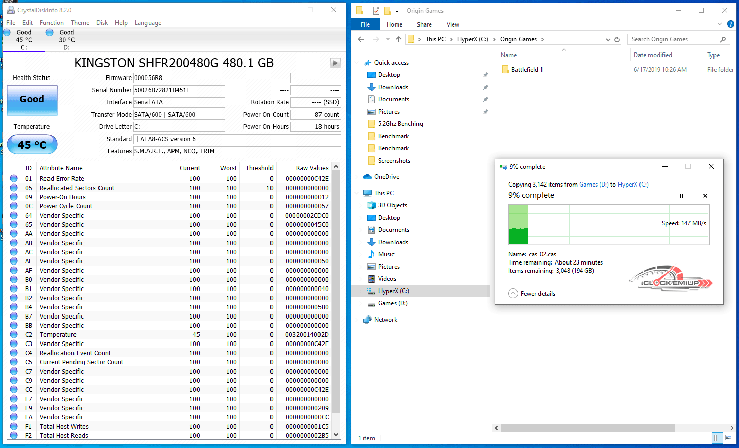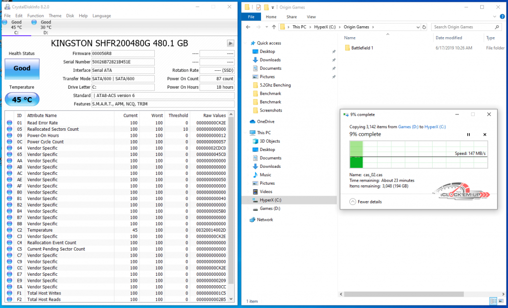 มาดูในเรื่องของอุณหภูมิในการทำงานของมันดีกว่าครับ วึ่งผมบอกก่อนเลยว่าหลังจากที่เปิดเครื่องใช้งานไปสัก 3-5 นาทีตัว SSD จะค่อนๆ ร้อนขึ้นแบบเห็นได้ชัดเจน โดยอุณหภูมิจะไปนิ่งอยู่ในช่วง Idle หรือการเปิดไว้เฉยๆ ผมวัดได้ 40-41c องศาเซลเซียสโดยประมาณครับ จับดูก็อุ่นๆ ร้อนๆ เลยทีเดียว ตอนแรกก็ตกใจอยู่ว่าทำไมร้อนขนาดนี้ ทั้งๆ ที่ยังไม่ด้ทดสอบอะไรเลย…. และในช่วงที่มีการ Copy ไฟล์เกมเข้าตัว SSD ให้มันเขียนลงตัว 3D NAND ของมัน ก็พบว่าอุณหภูมิก็ขึ้นมาอิ่มตัวสูงสุดอยู่ที่ประมาณ 44-45c องศาเซลเซียสตลอดการทดสอบครับ และก็ไม่ขึ้นมากไปกว่านี้แล้วจาก Sensor ที่วัดจากตัวโปรแกรม CrystalDiskInfo 8.2.0 และจากมิเตอร์ที่ผมวัดจากข้างนอกตัวมันก็วัดได้ราวๆ 41-42c องซาเซลเซียสครับ