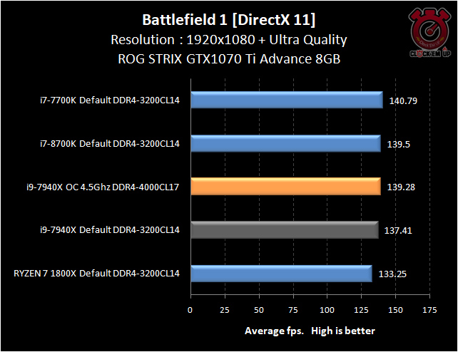 มาต่อกันเลยกับความสามารถในการเล่นเกมหรือการปั่น fps. ของเกมด้วยกราฟิกการ์ดที่เราเลือกใช้ในครั้งนี้คือ ROG STRIX GTX 1070 Ti Advance 8GB ซึ่งมาดูกันเลยผลการทดสอบค่าเฟรมเรทเฉลี่ย Average ของเกม Battlefield 1 นั้นเจ้า i9-7940X 14C/28T นั้นความเร็วเดิมๆ ปั่นเฟรมเฉลี่ยได้ที่ 137.41 fps และช่วงที่ OC @ 4.5Ghz ปั่นเฟรมเฉลี่ยเพิ่มขึ้นมาได้อีกไม่เยอะมากครับ ที่เฟรมเฉลี่ย 139.28fps. แต่ทั้งหมดโดยรวมเทียบกับ CPU รุ่นอื่นๆ แล้วอย่างเช่น i7-7700K และ i7-8700K แล้วเฟรมก็ไม่ได้ต่างอะไรกันมาก ที่ช่วง 139-140fps เฉลี่ยครับ รวมๆ แล้วเกมนี้น่าจะเน้นที่ Ghz สูงๆ เป็นหลักมากกว่าจำนวน Core ครับ