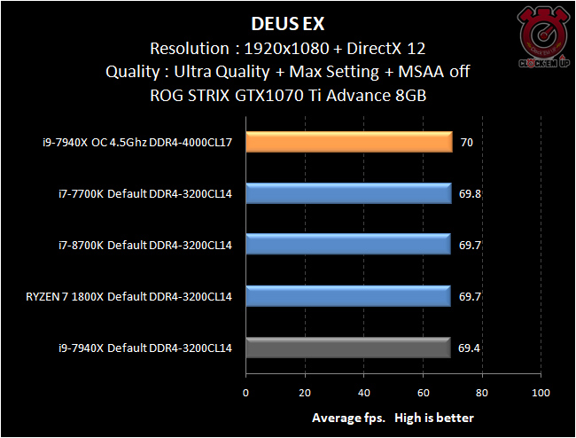 ส่วนทางด้านเกม DEUS EX นั้นกลับเป็นว่าเจ้า i9-7940X แบบเดิมๆ และ OC แล้วนั้นให้ผลการทดสอบไม่ได้ต่างอะไรกันมาก โดยเกมนี้ผมว่าไม่มี CPU รุ่นไหนในกราฟนี้คอร์ขวดเลยสักตัว น่าจะสุดที่ตัวกราฟิกการืดแล้วมากกว่า เพราะเฟรมเรททั้งหมดของ CPU แต่ละรุ่นทำได้ประมาณ 69fps เฉลี่ยกันทั้งหมดครับ สรุปแล้ว Engine ของเกม มีผลต่อการปั่น fps. ของ CPU อย่างชัดเจน