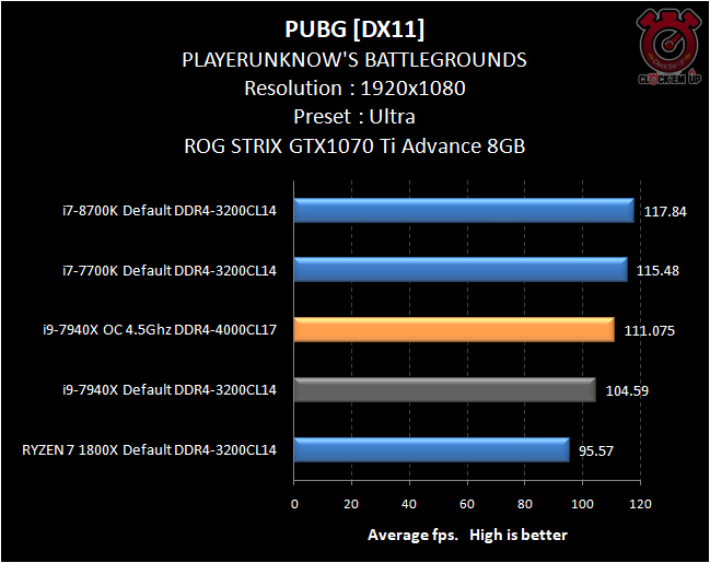 และเกมสุดท้ายที่เราหยิบเอามาทดสอบในครั้งนี้ก็คือ PUBG นั่นเองครับ ซึ่งเราจะรันจาก Replay ในฉากเดิมของเกมแล้วจับผลการทดสอบด้วย Fraps. เพื่อหาค่าเฉลี่ยในเกม ซึ่งก็พบว่า CPU ที่มี Ghz สูงๆ อย่าง i7-8700K ที่มีช่วง Boost สูงสุด 4.7Ghz นั้นสามารถปั่นเฟรมเรทได้ดีมากเลยทีเดียวครับ ส่วนเจ้า i9-7940X นั้นทำได้ในระดับ 104.59fps และช่วง OC @ 4.5Ghz เฟรมเรทเฉลี่ยเพิ่มขึ้นมาที่ 111.075fps หรือเพิ่มขึ้นมาประมาณ 6.4fps เฉลี่ยนั่นเอง สรุปโดยรวมแล้ว เกม PUBG เน้น CPU ที่มีความเร็วในการสูงๆ เป็นหลักครับ ดังนั้น Clock Speed แรงเท่าไรก็ยิ่งแรงเท่านั้น….