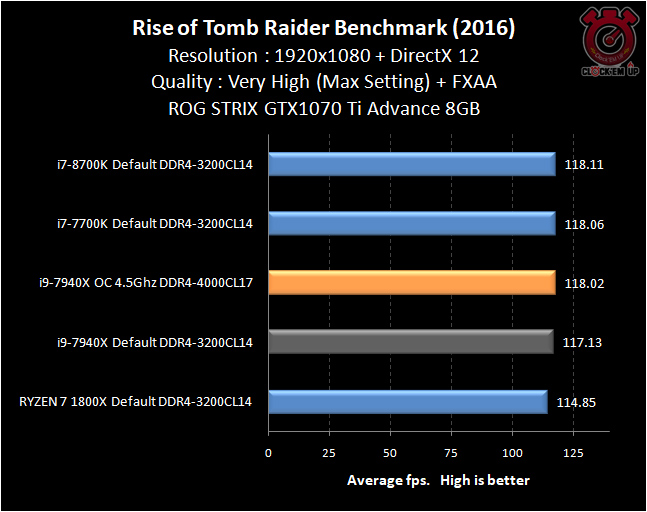 ส่วนเกม Rise of Tomb Raider นั้น CPU ของฝั่ง Intel ก็ทำการปั่นเฟรมเรทเฉลี่ยออกมาได้ราวๆ 117-118fps พอๆ กันทั้งหมด ส่วนทาง RYZEN 7 1800X นั้นทำได้ที่ 114.84fps. คงต้องเอาไว้รอดูผลเทียบเพิ่มเติมของ RYZEN 7 2700X เร็วๆ นี้ครับ ^^”