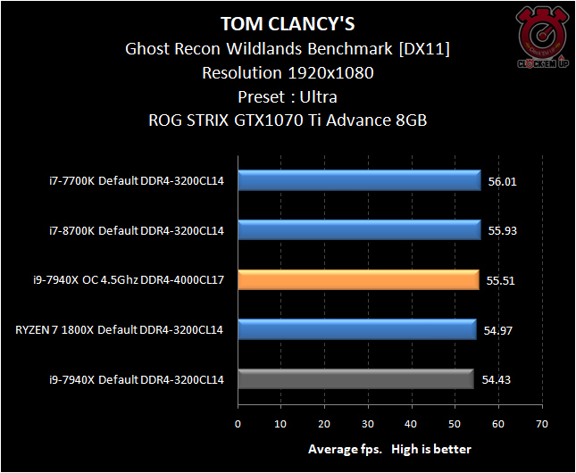มาต่อกันเลยกับ Ghost Recon Wildlands นั้นดีที่สุดในกราฟแผ่นนี้คือ i7-7700K ครับ ส่วน i9-7940X นั้นผมมองว่าทำได้ไม่ค่อยดีเท่าไรนัก ซึ่งเป็น Scale เดียวกับ The Division เลยล่ะครับ คาดว่าเกมค่ายนี้น่าจะไม่ถูกกับ CPU ที่มีหัวเยอะๆ ถึง 28 Threads ครับ