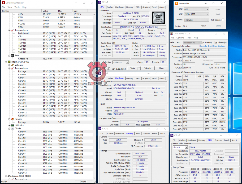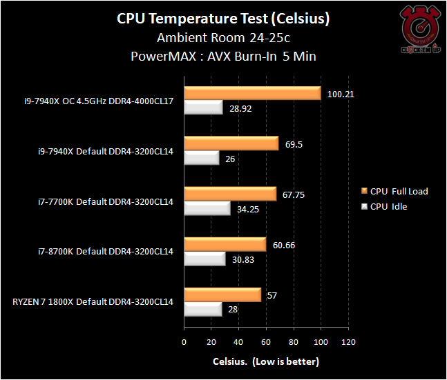 และจากการทดสอบพบว่าที่ความเร็ว Default ของ CPU Intel Core i9-7940X นั้นอุณหภูมิช่วง Idle/Full Load อยู่ที่ 26/69.5c องศาเซลเซียสเท่านั้น และหลังจาก Overclock CPU ขึ้นไปในระดับ 4.5Ghz/Cache 3.0Ghz Vcore 1.28V นั้นพบว่าช่วง Full Load ด้วยโปรแกรม CPUID Powermax ที่ใช้ Code AVX ในการทดสอบ Burn-in เป็นเวลา 5 นาที นั้นแสดงให้เห็นความร้อนในระดับ 100c+ กันเลยทีเดียวครับหุหุ…. ใครคิดเจะ Overclock CPU รุ่นใหญ่แบบนี้ คุณต้องแน่ใจก่อนว่ามีชุด Cooling ที่รับมือได้หรือป่าว…. สรุปแล้วถ้่าใช้งานเดิมๆ ไม่ต้องห่วงเรื่องความร้อนใดๆ ทั้งสิ้นครับ