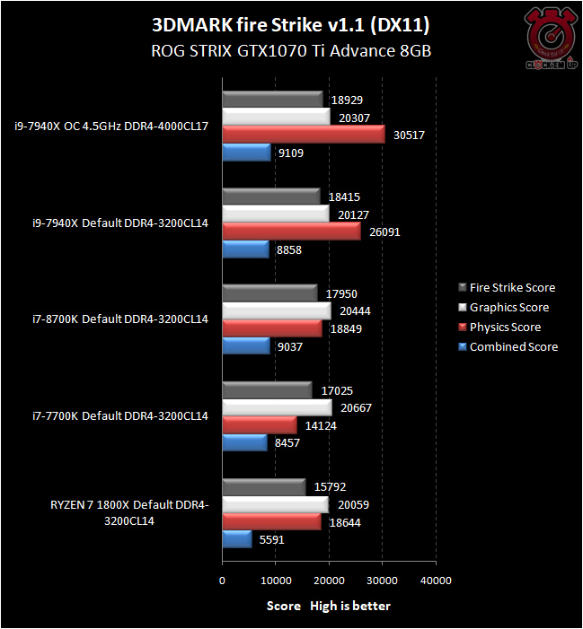 ต่อกันเลยกับ 3DMARK Fire Strike ซึ่ง CPU ที่มีจำนวนคอร์เยอะกว่า ก็จะให้แต้มคะแนนรวมที่สูงกว่าอยู่แล้วครับ ดังนั้น i9-7940X 14C/28T จึงได้เปรียบอย่างมาก รวมถึงคะแนนเฉพาะ Graphics Test ก็ทำออกมาได้ค่อนข้างดีเลยทีเดียว….