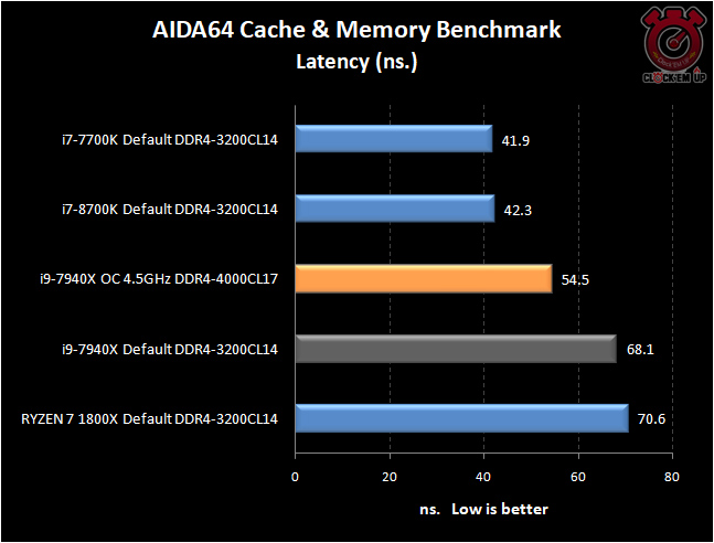 ส่วนด้านเรื่อง Latency นั้นจะเป็น CPU i7-7700K ที่ทำได้ดีที่สุดคือ 41.9ns. ส่วน i9-7940X นั้นแบบเดิมๆ มีค่า Latency อยู่ที่ 68.1ns. และหลังจาก OC แล้วก็ดีขึ้นแบบชัดเจนที่ 54.5ns.