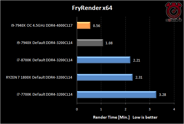 ดูกันต่อกับ FryRender บอกได้เลยว่าหัวเยอะๆ ก็คงได้เปรียบอยู่เหมือนเดิม กับเวลาที่รวดเร็วในการ Render ลองสังเกตุดูตอน OC @ 4.5Ghz ซิครับ… ใช้เวลาไม่ถึง 1 นาที โอว์แม่จ้าว…จะแรงไปไหน ^O^