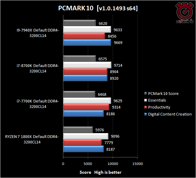 ส่วนคะแนนจากโปรแกรม PCMARK 10 รุ่นล่าสุดนั้นก็ทำหน้าที่ได้ดีที่สุดในการทดสอบเทียบกับ CPU รุ่นอื่นๆ และดูเหมือนว่า Intel จะได้เปรียบในการทดสอบนี้อย่างมาก เพราะเทียบจาก RYZEN 7 1800X แล้วดูเหมือนจะปั่นคะแนนไม่ออก ถึงแม้ว่าจะเป็น CPU 8C/16T ก็ตาม โดยรวมแล้วผมมองว่าโปรแกรมนี้ เน้น Ghz ความเร็วของ CPU เป็นหลักด้วยถึงจะได้แต้มออกมาเยอะ….