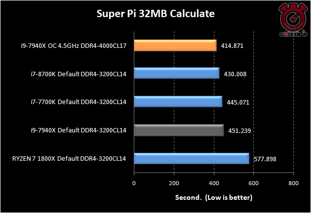 โปรแกรม Benchmark ทดสอบแรกกับ Super Pi 32MB แบบหัวเดียว Single Thread นั้นความเร็วเดิมๆ ของ Core i9-7940X นั้นใช้เวลาในการคำนวณที่ 451.239 วินาที และเมื่อทำการ Overclock @ 4.5Ghz แล้วพบว่าใช้เวลาในการทดสอบดีที่สุดในตางรางที่เวลา 414.871 วินาที