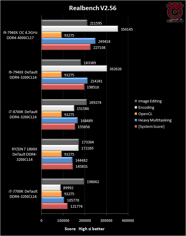 ส่วนทางด้าน Realbench V2.56 นั้นเจ้า i9-7940X 14C/28T ตัวนี้ก็ยังคงทำคะแนนรวมได้ดีกว่า CPU ทุกๆ รุ่นในการทดสอบนี้ โดยเฉพาะคะแนนในช่วง Encoding และ Heavy Multitasking นั้นเป็นงานที่เขาถนัดมากๆ