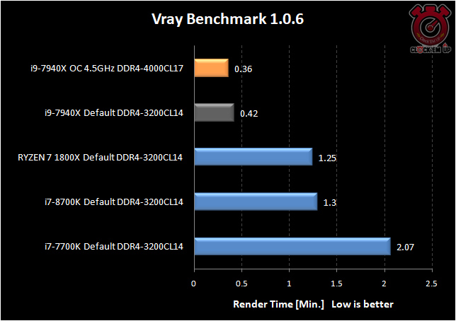 ต่อกันเลยกับ Vray Benchmark ซึ่งก็ต้องบอกเลยว่า เดิมๆ ก็แรงอยู่แล้ว เพราะใช้เวลาในการ Render ไม่ถึง 1 นาทีอยู่แล้วครับ และหลังจาก OC @ 4.5Ghz แล้ว ใช้เวลา Render เหลือเพียง 36 วินาทีเท่านั้นเอง และเทียบกับ 8700K 6C/12T แล้วต้องใช้เวลาถึง 1 นาที 30 วินาทีกันเลยทีเดียว