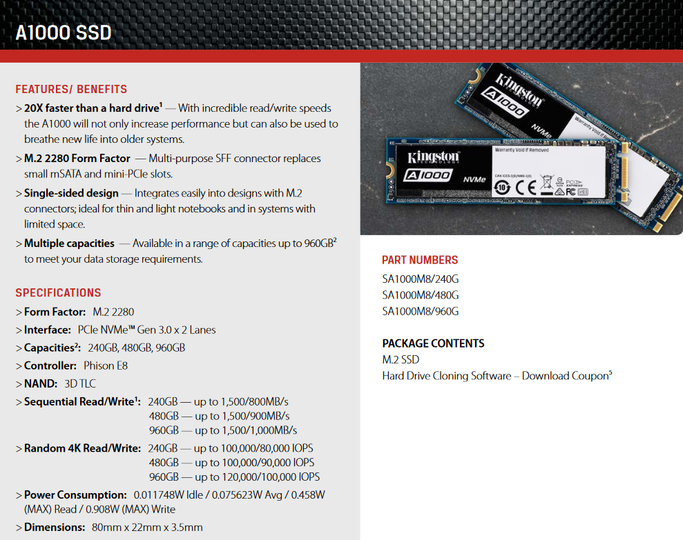 สำหรับรายละเอียดทางด้านเทคนิคนั้น Kingston A1000 NVMe SSD นั้นผลิตออกมาจำหน่ายทั้งหมดอยู่ 3 ขนาดความจุด้วยกันได้แก่ 240GB, 480GB และ 960GB ซึ่งในแต่ละรุ่นนั้นจะมี Spec ในเรื่องของความเร็วในการเขียนเพียงเล็กน้อยเท่านั้น โดยค่า Read จะอยู่ที่ระดับ 1500MB/s เท่ากันทุกขนาดความจุ ส่วนค่า Write ในรุ่นต่างๆ นั้นจะอยู่ที่ความเร็วดังนี้คือ รุ่นขนาดความจุ 240GB : 800MB/s, 480GB : 900MB/s และในรุ่น 960GB อยู่ที่ 1000MB/s ส่วนตัว Controller นั้นจะเลือกใช้ของ Prison E8 ในทั้ง 3 รุ่น และเลือกใช้ชนิดของ NAND แบบ 3D TLC NAND Flash