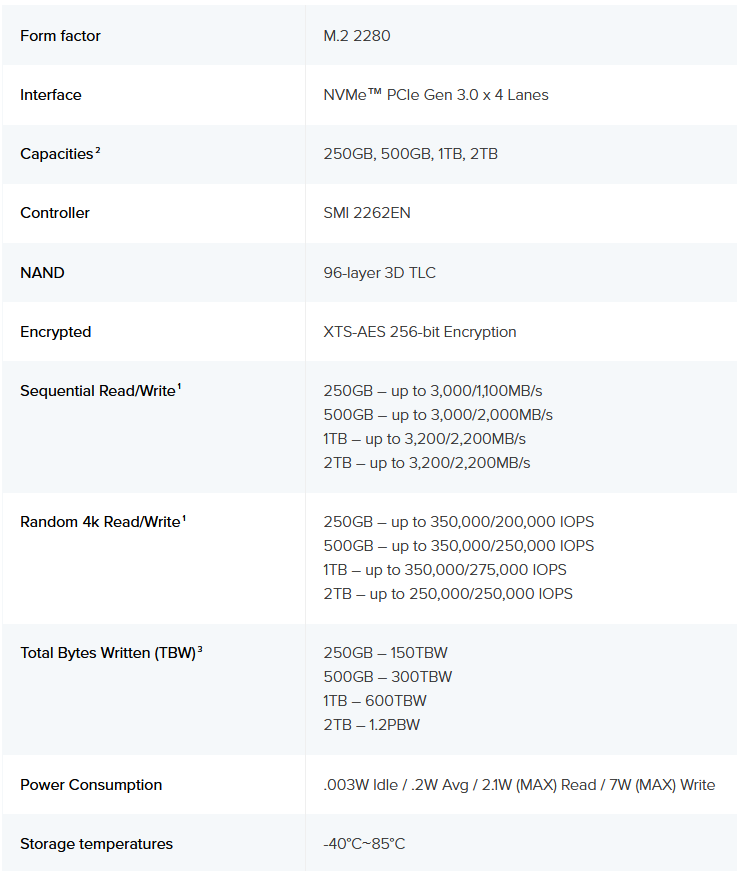 - Supports a full-security suite (TCG Opal 2.0, XTS-AES 256-bit, eDrive)