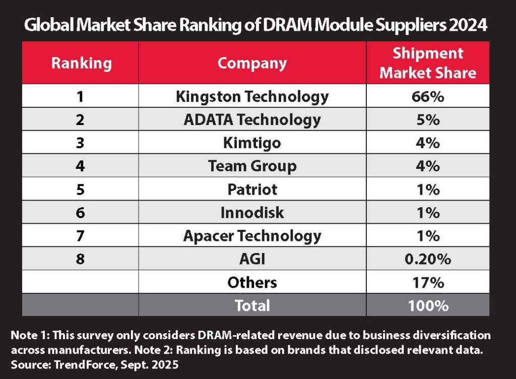 - Kingston ครองอันดับ 1 ด้วยส่วนแบ่งตลาด 66% ตามการจัดอันดับรายได้