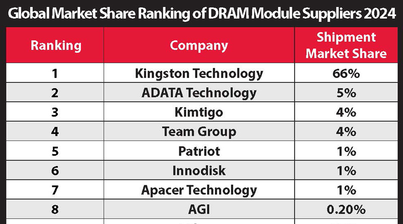 Kingston Technology ครองตำแหน่งอันดับหนึ่งซัพพลายเออร์โมดูล DRAM ประจำปี 2567