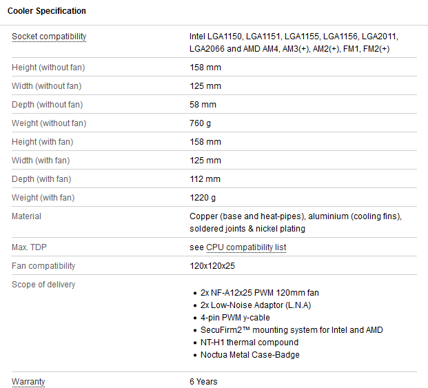 ดังนั้นการออกแบบของ NH-U12A นั้นจะเป็นการ Heatsink รุ่นเก่าอย่าง NH-U12S มาปรับปรุงใหม่ ให้มีท่อ Heatpipe มากถึง 7 เส้นและความหนาของครีบระบายความร้อนที่มากขึ้นกว่า 37% เลยทีเดียว และยังไม่พอแค่นั้น มันยังมาพร้อมกับพัดลมรุ่นใหม่ล่าสุดอย่าง NF-A12x25 ที่เป็นรุ่นที่ได้รับการพัฒนาให้มีประสิทธิภาพอยู่ระหว่างพัดลมรุ่นก่อนหน้านี้อย่าง NF-F12 และ NF-S12A จึงทำให้ NF-A12x25 นั้นกลายเป็นพัดลมที่เหมาะสำหรับเอาไประบายความร้อนให้กับหม้อน้ำ Radiator, Heatsink หรือแม้แต่เป็นพัดลมระบายความร้อนภายใน PC Case ก็ทำได้ดีมากด้วยเช่นกัน เพราะประสิทธิภาพโดยรวมทั้ง Pressure และ Air-Flow นั้นอยู่ระหว่างกลางของรุ่น NF-F12 (เน้นเรื่องแรงอัดอากาศ Pressure ดีที่สุด) และ NF-S12A (มีอัตราการตักลม Air-Flow ได้ดีที่สุด) อย่างที่ได้กล่าวเอาไว้ครับ ดังนั้นเมื่อ NH-U12A ใช้งานร่วมกับพัดลมรุ่นใหม่ล่าสุดอย่าง NF-A12x25 จำนวน 2 ตัวแล้วทาง Noctua เคลมว่ามันจะเย็นเทียบเท่ากับหรือดีกว่า Heatsink ขนาด 140mm ของตัวเองและของคู่แข่งได้สบายๆ เลยล่ะครับ… หรือเป็นที่มาของคำว่า “140mm performance in 120mm size” นั่นเอง…