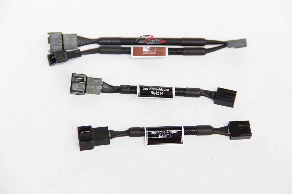 สาย Y-Cacble เอาไว้รวมพัดลมเป็นจุดเดียว มีให้ 1 เส้น และสายไฟลดรอบการทำงานของพัดลมเพื่อให้เงียบลงอีก 2 เส้น เรียกว่า Low-Noise-Adapter “NA-RC14”
