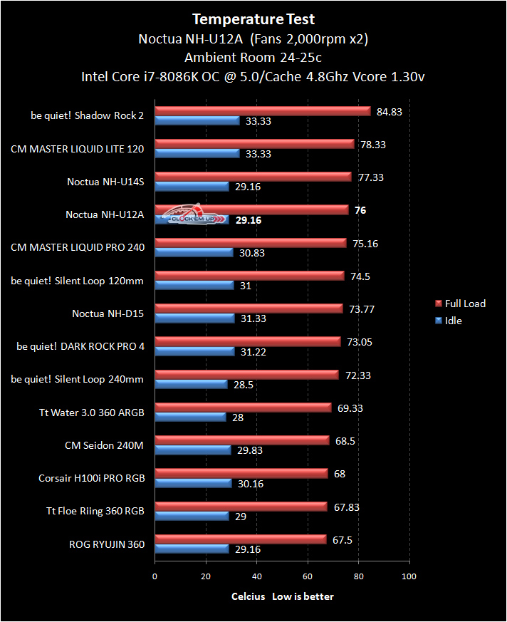 เอาล่ะครับมาดูผลการทดสอบแบบ Overclock เพิ่มความร้อนขึ้นกันอีกนิด ก็พบว่าผลการทดสอบก็ยังเย็นกว่า NH-U14S อยู่ราวๆ 1.33c องศาเซลเซียส ที่ความเร็ว CPU @ 5.0Ghz/4.8Ghz ได้อีกด้วย จัดว่าไม่ธรรมดาอย่างที่ Noctua กล่าวไว้ว่า มันคือ Heatsink ที่ใช้พัดลมขนาด 120mm. ที่มีประสิทธิภาพเทียบเท่ากับ Heatsink ที่ใช้พัดลมขนาด 140mm. จริงๆ ด้วยครับ หุหุ…