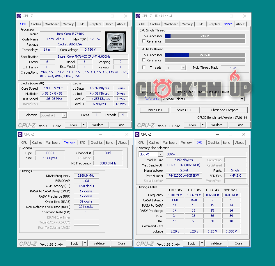 CPU-Z 1.83 Benchmark นั้นที่ความเร็ว CPU @ 5.933Ghz/Cache 5.08Ghz + DDR4-4376Mhz CL17-17-17-39 2T นั้ทปั่นคะแนน Single Thread ได้ที่ 716.2 แต้ม และปั่นคะแนน Multi-Threads ได้ที่คะแนน 2705.3 แต้มกันเลยทีเดียว หุหุ นี่เป็นแค่ CPU แบบ 4C/4T เท่านั้นเอง…