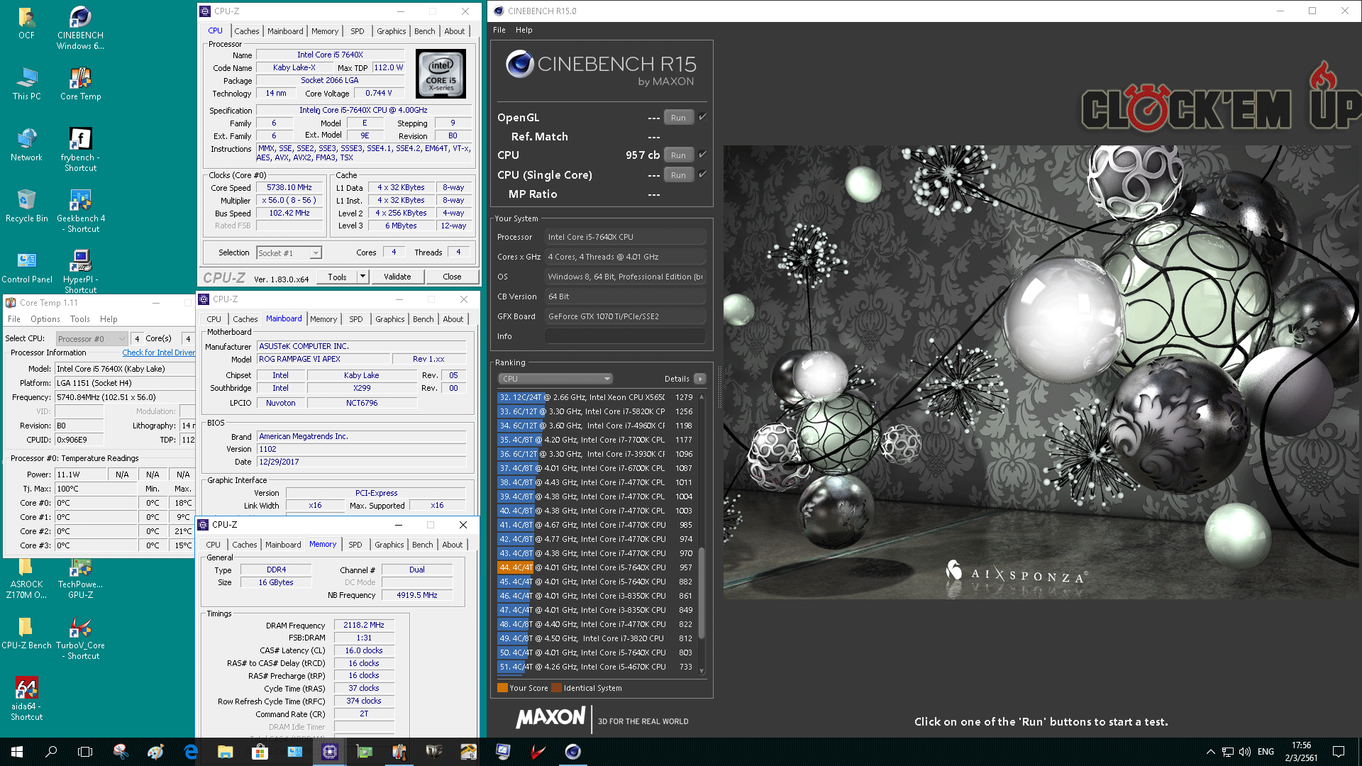 Cinebench R15 นั้นบอกได้เลยว่าร้อนแรงมากเลยทีเดียวถึงแม้ว่า CPU ตะมีอุณหภูมิช่วงติดลบต่ำกว่า -30c ก็ตาม แต่พอทดสอบ Rendering แล้วอุณหภูมิในแกน CPU นั้นแสดงให้เห็นถึงระดับ 21c องศาเซลเซียสกันเลยทีเดียว นี่ขนาดความเร็วแค่ 5.7xGhz เท่านั้นนะครับ ดังนั้นแสดงให้เห็นว่าถ้าต้องการไปไกลกว่านี้ ต้องมีมีติดลบมากกว่านี้แล้วล่ะครับ ฮ่าๆ ส่วนคะแนนที่ทำได้นั้นคือ 957 แต้มนั่นเอง…