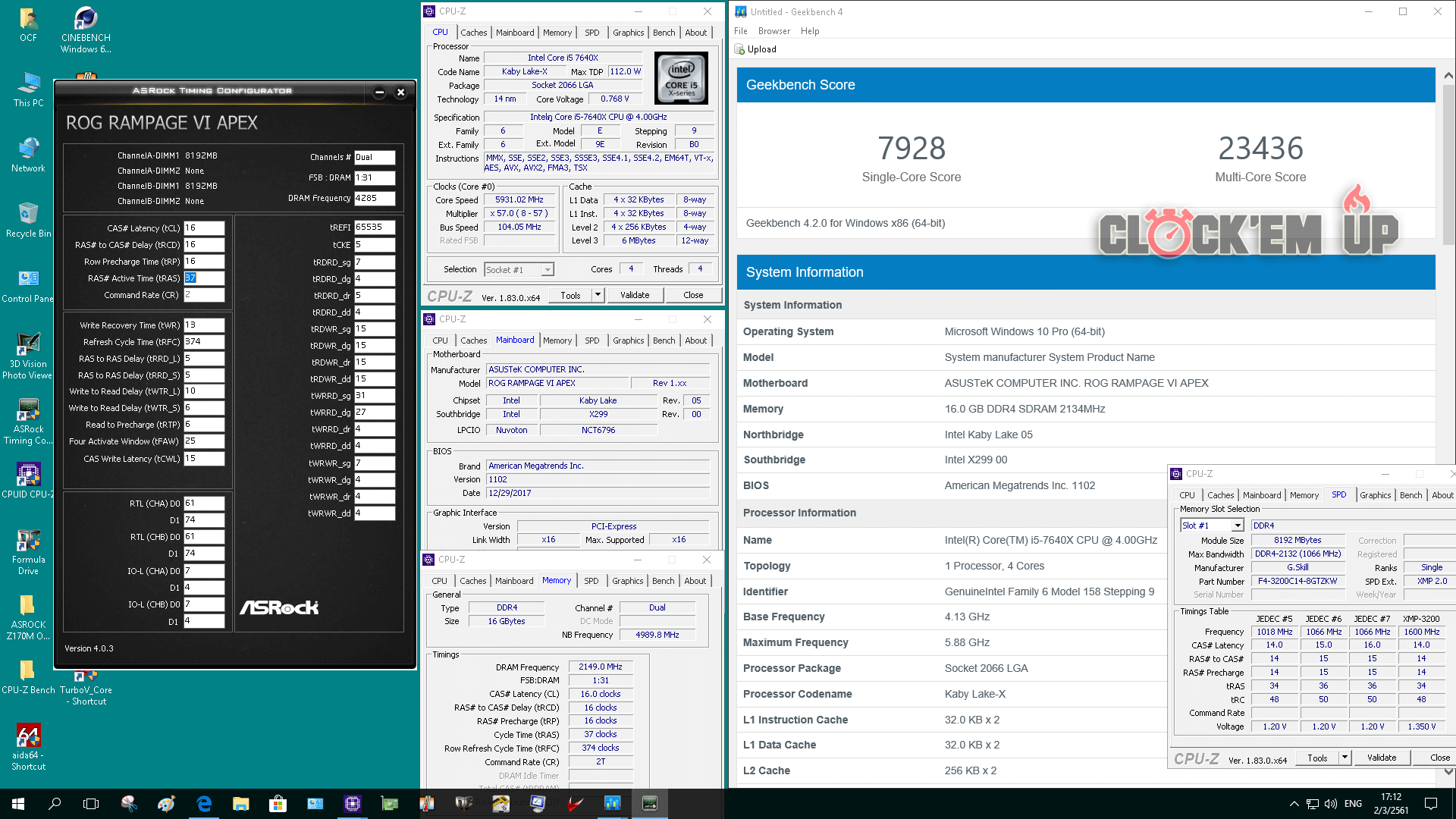 ปิดท้ายด้วยโปรแกรมยอดฮิมสำหรับนัก Overclocker ไทยอีกหนึ่ง Benchmark นั่นคือ Geekbench 4 นั่นเองครับ โดยเราสามารถ Overclock CPU ตัวนี้ให้สามารถ Benchmark ผ่านได้ที่ความเร็วประมาณ 5.93Ghz/Cache 4.98Ghz + DDR4-4300Mhz CL16-16-16-37 2T ด้วยคะแนนที่ออกมาคือ Single-Core @ 7928 แต้มและคะแนนของ Multi-Core @ 23436 แต้มกันเลยทีเดียว จัดว่าไม่ธรรมดาแล้วสำหรับ CPU แบบ 4-Core/4Thread ครับ และทั้งหมดนี้ก็เป็นความแรงในแบบฉบับมินิ Extreme สำหรับการ benchmark แบบขำๆ ของ CPU Intel Core i5-7640X 4C/4T ด้วยการระบายความร้อนด้วย Single Stage Phase Change อุณหภูมิติดลบประมาณ -30c ถึง -48c องศาเซลเซียส ซึ่งก็สามารถให้ผลการทดสอบที่น่าประทับใจดีระบบหนึ่งเลยทีเดียว เพราะมันไม่ต้องคอยเติม LN2 หรือกังวลเรื่องว่าเมนบอร์ดจะเปียกน้ำ เพราะมันมีชุด Cover ในการติดตั้งบริเวณหัว Evap ที่ติดกับ CPU ที่กันความชื้่อนได้ดีระดับหนึ่ง เล่นเสร็จก็ไม่ต้องมาเช็ดน้ำ พักแล้วเล่นต่อได้เลยทันทีครับ แต่หากต้องการความ Extreme แบบสุดๆ ยังไงก็ต้องพึ่งความเย็นจาก LN2 สถานเดียว เพราะตัวมันเองติดลบได้สูงสุดกว่า -195.79c องศาเซลเซียสกันเลยทีเดียว หุหุ… สุดท้ายนี้ก็ขอฝากติดตามผลของพวกเราทีมงาน Clock’EM UP กันด้วยนะครับ เร็วๆ นี้เรามี Project Extreme Sub-ZEO ให้เพื่อนๆ ได้ชมกันอีกแน่นอน… สวัสดีครับ