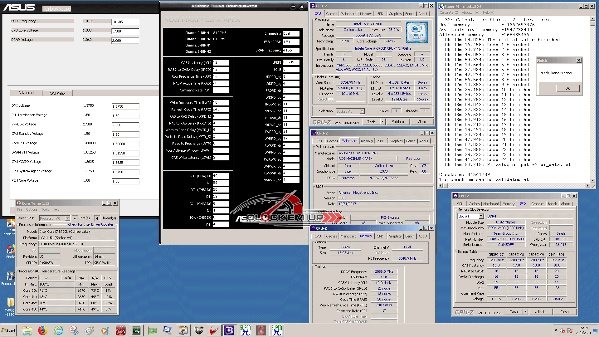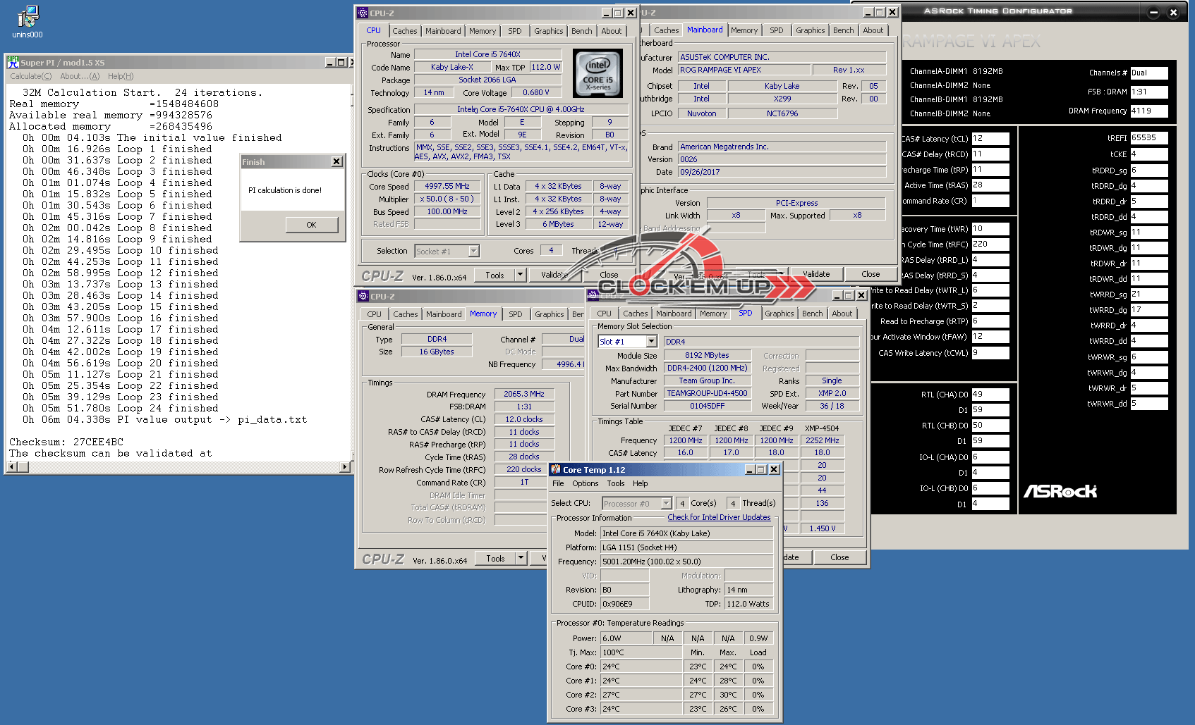 ผลงานชัดแรกเลยกับเมนบอร์ด ROG RAMPAGE VI APEX + i5-7640X ทดสอบ Pi32MB ที่ Scale ความเร็ว 5.0Ghz/Cache 5.0Ghz ด้วยแรม DDR4-4133CL12-11-11-28 1T ผ่านได้ฉลุยครับ เวลาจบที่ 6m04.338s (non waza) Win7-64bit จัดว่าเด็ดครัช….