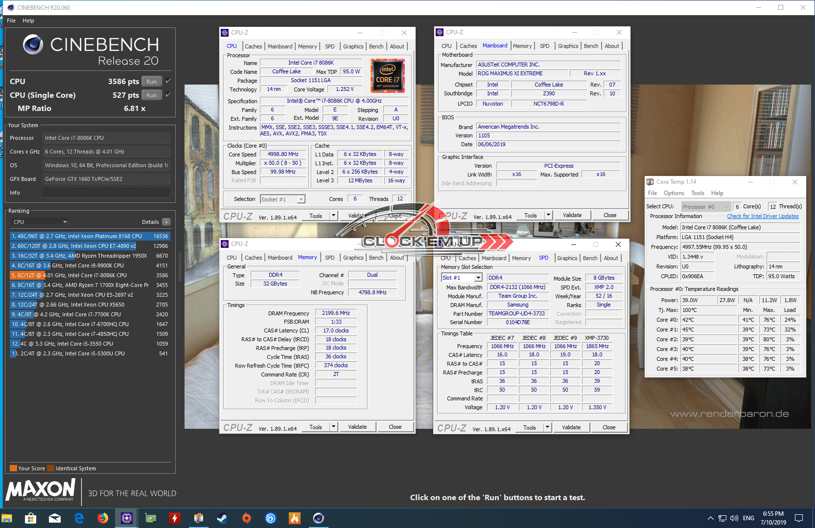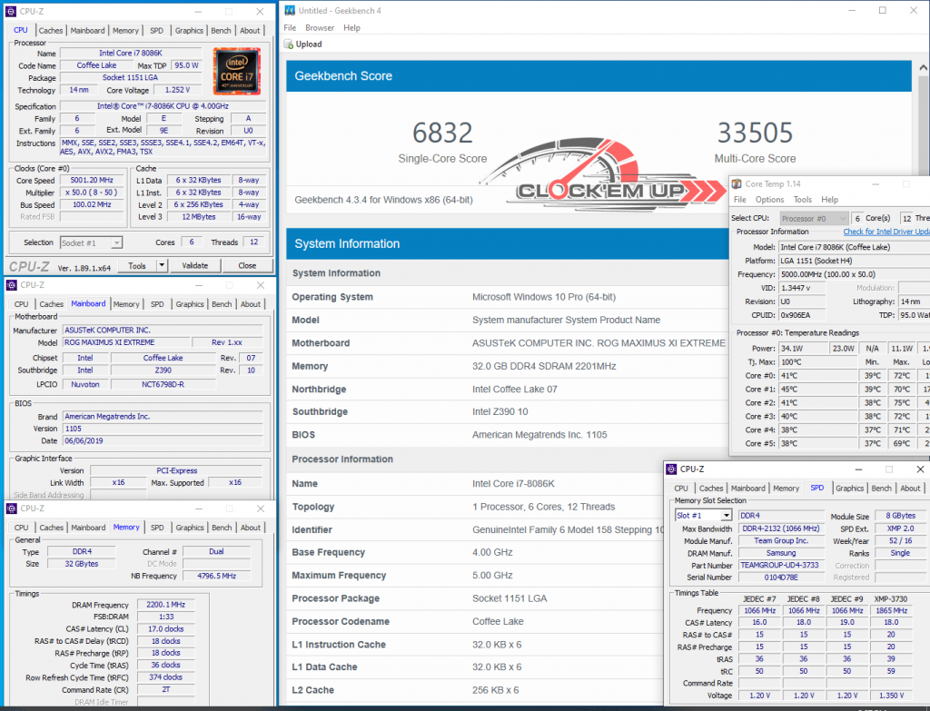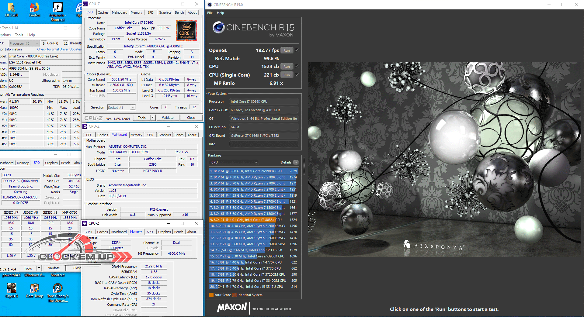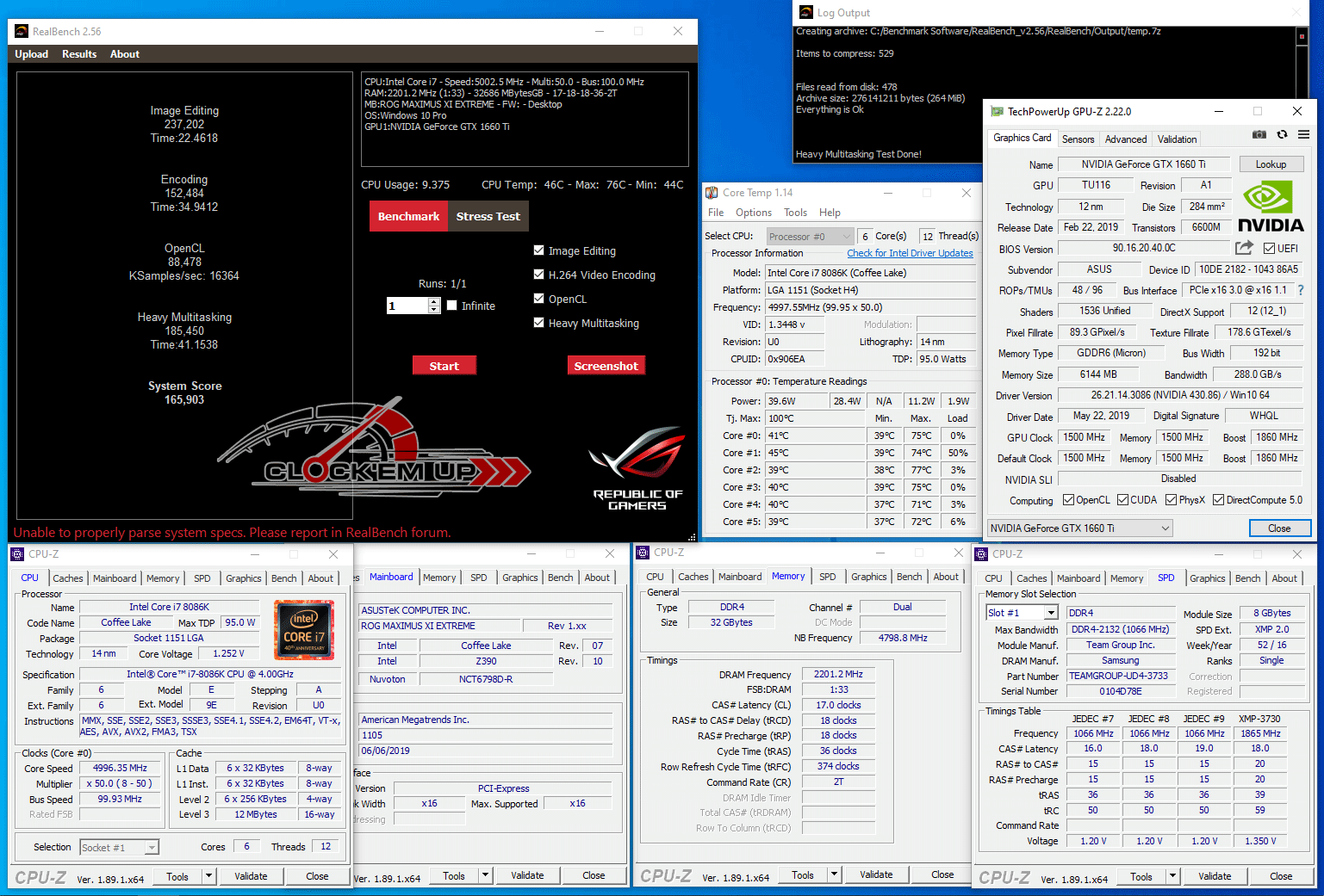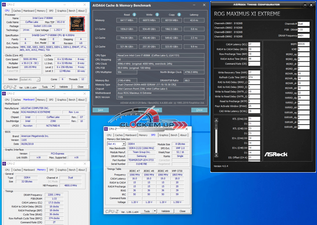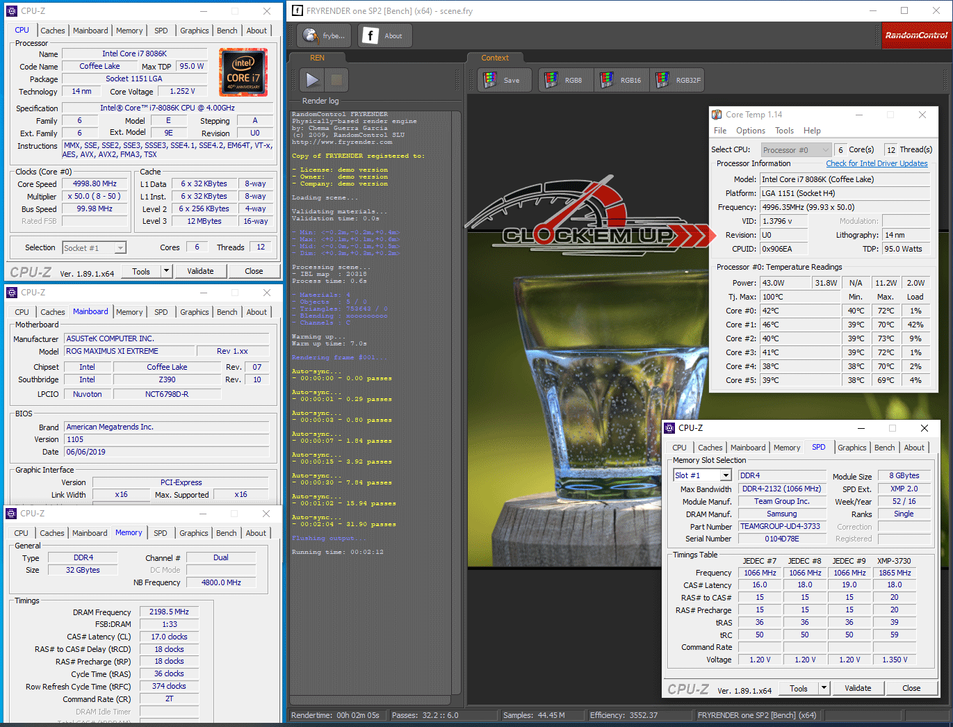เอาล่ะครับก็มาถึงช่วงของการทดสอบแล้ว โดยวันนี้ค่า Config หลักในการ Overclock ครั้งนี้ก็คือความเร็ว CPU Intel Core i7-8086K 6C/12T ทำงานที่ความเร็ว 5.0Ghz/Cache 4.8Ghz All Core ใช้ไฟเลี้ยงที่ตั้งจาก BIOS 1.25V + LLC Level 8 และในเรื่องของการ Overclock แรมนั้นเราตั้งโจทย์ไว้ที่ DDR4 ความเร็ว 4400Mhz ด้วยแรมที่ติดตั้งไปจำนวน 4 แถว โดยเป็น Samsung B-Die ทั้ง 4 แถว และผลการทดสอบของเราที่ดูแล้วค่อนข้างเป็นไปได้ก็คือที่ความเร็วแรม DDR4-4400Mhz CL17-18-18-38 2T 1.52V พรอ้มกับการปรับแต่ง Sub-Timing ที่พอจะทำให้ระบบเสถียรภาพพอที่จะรัน Bechmark ต่างๆ ผ่านได้แบบไม่ยากเย็นนัก แต่ก็ไม่ถึงกับว่าจะเสภียรแบบ 100% นะครับ เพราะถ้าจะเอา Memtest ผ่านด้วยนี่ เราแทบจะแตะ Sub-timing ตัวหลักๆ ไม่ได้เลย ดังนั้นรีวิวฉบับนี้ก็จะให้ชมถึงพลังความแรงของ Config นี้ให้สาวก ROG ได้ชมกันไปก่อน… เพราะแค่นี้ ก็งานหินมากๆ แล้วครับพี่น้อง x_x…
