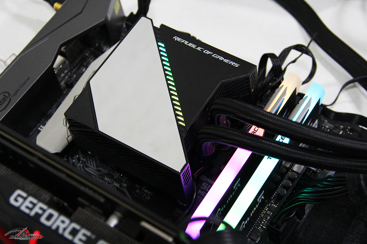 ตัวอย่างการต่อใช้งานตัว ROG RYUJIN 360 ครับผม โดยบริเวณตัว Block จะมีไฟ LED RGB Color แสดงออกมาเป็นแถบเฉียงๆ บนตัว Block โดยรองรับการต่อใช้งานแบบ AURA Sync ด้วยนะครับ และสำหรับตัวจอ OLED ก็สามารถแสดงเป็น ROG Logo และไฟล์ .gif แบบเคลื่อนไหวได้