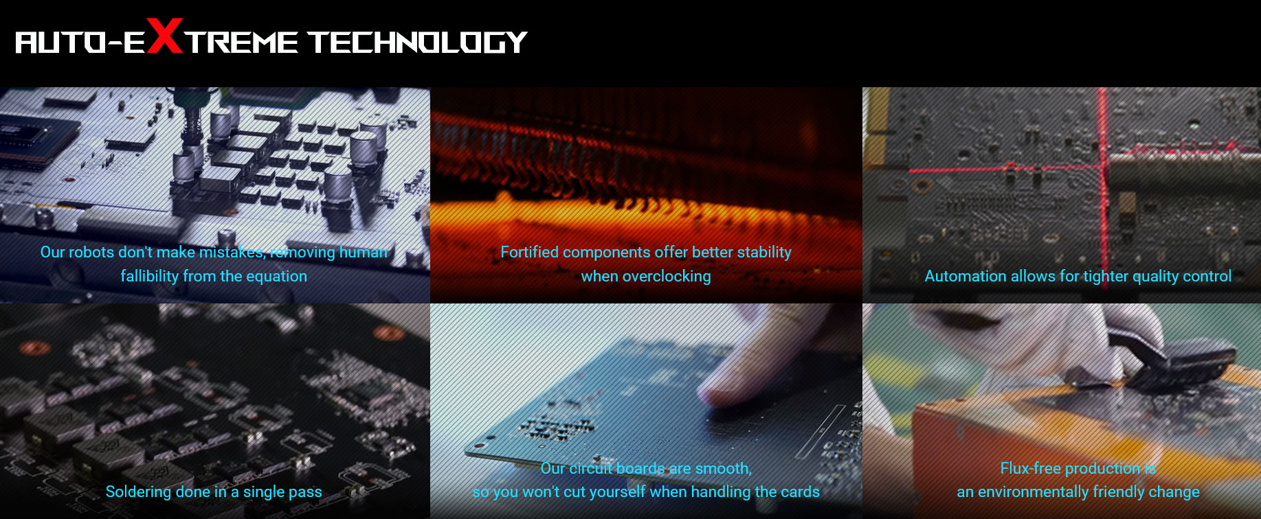 แต่สิ่งที่ทำให้การ์ดจอ ROG Strix มีชื่อเสียงในด้านความเสถียรคือ Auto-extreme technology ที่เป็นระบบการผลิตแบบอัตโนมัติ 100% โดยใช้หุ่นยนต์ ซึ่งระบบนี้ถือว่ามีประโยชน์ในหลายๆด้านไม่ว่าจะเป็น ลดความร้อนที่เกิดขึ้นบน PCB ด้วยการบัดกรีเพียงครั้งเดียว ไม่มีความผิดพลาดที่เกิดจากมนุษย์ ไม่มีสารเคมีตกค้างบน PCB ลดการใช้พลังงานในการผลิตและเป็นมิตรกับสิ่งแวดล้อม
