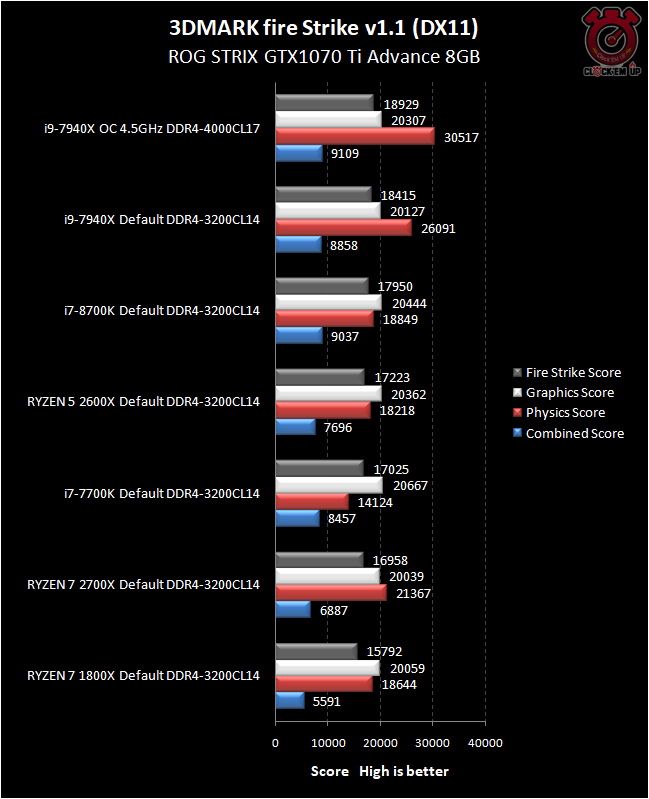 และยังมีผลการทดสอบเป็น Scale แบบเดิมครับครับ โดยที่ 2700X นั้นยังคงได้เปรียบเรื่องคะแนนรวม CPU Score เมื่อเทียบกับ 8700K เพราะว่ามันมีจำนวน Thread ที่มากกว่า ดังนั้น 2700X จึงมีคะแนนรวมที่ดีกว่านั่นเอง ส่วนถ้ามองแค่คะแนนของ Graphics Score นั้น CPU แถบทุกรุ่นมีประสิทธิภาพพอๆ กันหมด ด้วยคะแนนที่อยู่ในระดับ 3110-3160 แต้ม มีเพียงแต่ 8700K เท่านั้นที่กระโดไปที่ระดับ 3632 แต้ม ซึ่งค่าว่าอาจจะเป็นเพราะตัวมันเองสามารถ Boost ได้มากถึง 4.7Ghz สูงสุด จึงทำให้สามารถปั่นเฟรมเรทในการทดสอบได้ดีกว่าเพื่อน…. สรุปผลการทดสอบโดยรวมแล้วความเร็วในการทำงานของ CPU นั้นยังเป็นคำตอบที่ดีที่สุดสำหรับทุกๆ กันทดสอบโดยเฉพาะเรื่องของการทดสอบด้าน 2D และการปั่นเฟรมเรทในการทดสอบเกมต่างๆ ล้วนตอบสนองกับความเร็วของ CPU เป็นหลัก ส่วนในเรื่องของการ Render/Encoding นั้นก็จะเป็นเรื่องของจำนวน Threads เป็นหลัก ซึ่ง CPU รุ่นไหนมีหัวหรือคอร์ที่เยอะกว่า ก็ทำงานได้เร็วกว่า เป็นเรื่องธรรมดาครับ…