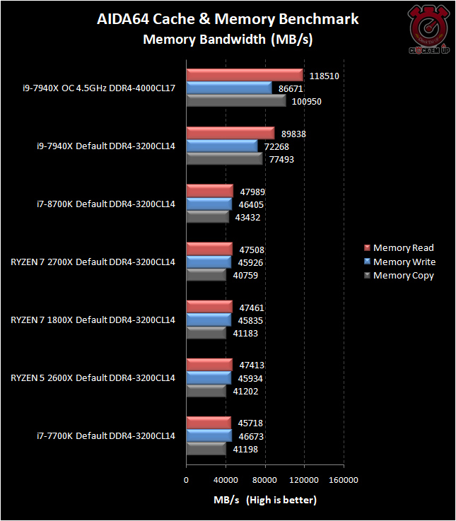 มาดูกันต่อในเรื่องของ Memory Bandwidth กันบ้างครับ โดยชุดทดสอบของ CPU แต่ละ Set นั้นจะทำงานที่ความเร็วแรม DDR4 เท่ากันทั้งหมดที่ DDR4-3200CL14-14-14-34 1T และปล่อย Sub-Timing แบบ Auto ตามที่เมนบอร์ดปรับแต่งให้ โดยภาพรวมแล้วจัดว่าทาง AMD ปรับปรุงเรื่องของระบบ Memory Bandwidth มาได้ค่อนข้างดีเลย ซึ่งค่า Read นั้นทำได้ในระดับ 47K+ ได้พอๆ ไม่ว่าจะเป็น 2700X, 2600X และ 1800X ส่วนค่า Write และ Copy นั้นอาจจะไม่เก่งสู้ฝั่ง Intel ได้ ลองพิจารณาดูตามผลการทดสอบด้านบนนี้เลยครับ