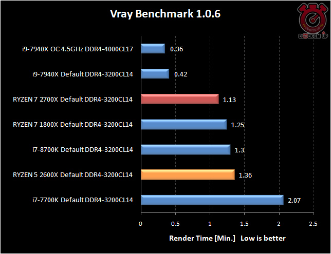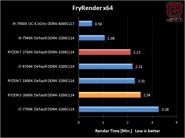 ส่วนโปรแกรม FryRender x64 นั้นดูเหมือนจะเข้าทางฝั่ง Intel นะ ลองดู 8700K สิครับครับ ทำเวลาในการ Render ได้อยู่ระหว่าง 2700X และ 1800X ที่เป็น CPU แบบ 8C/16T ทั้ง 2 รุ่น แต่รวมๆ แล้ว 2700X ก็ยังได้เปรียบเรื่องประสิทธิภาพต่อราคาอยู่ดี ส่วนเจ้า 2600X นั้นก็ไม่ค่อยเด่นอะไรมากนักครับ