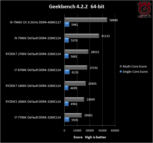 ต่อกันเลยกว่าโปรแกรมยอดนิยมอย่าง Geekbench 4.2.2 โดยจากการทดสอบดูแล้วพบว่า 2700X นั้นคะแนน Multi-Core ออกมาได้ค่อนข้างดีในระดับ 28532 แต้ม และเมื่อเทียบกับของเดิมอย่าง 1800X นั้นทำได้เพียง 25445 แต้มเท่านั้น ส่วนเจ้า 2600X นั้นทำคะแนน Multi-Core ออกมาได้ที่ 23609 แต้ม