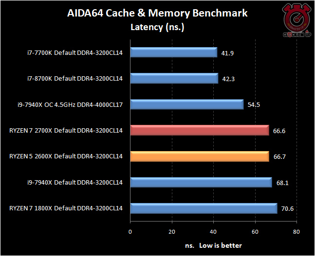 และในส่วนของเรื่อง Memory Latency นั้นจัดว่าเจ้า 2700X และ 2600X นั้นปรับปรุงมาได้ดีขึ้นเมื่อเทียบกับ 1800X ที่ทำได้ในระดับ 70.6ns. เท่านั้น ส่วน 2700X และ 2600X นั้นทำได้ประมาณ 66.6-66.7ns. ถือว่าเข้าถึงข้อมูลได้รวดเร็วกว่านั่นเอง… ถึงแม้จะใช้แรมความเร็วเดียวกันที่ระดับ DDR4-3200Mhz CL14 เท่ากัน