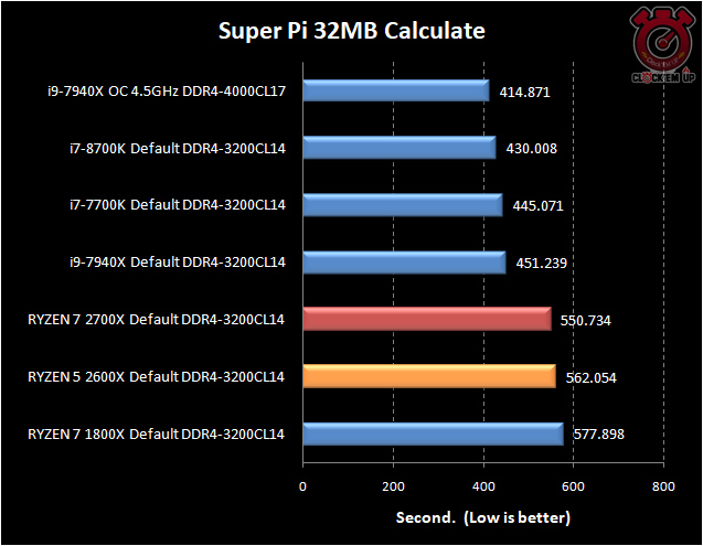 มาดูกันที่ Benchmark ตัวแรกกันเลยกับ Super Pi32MB Single Thread หัวเดียว ซึ่งอย่างที่เราทราบกันดีอยู่แล้วว่า AMD อาจจะไม่ถนัด Super Pi เท่าไรนัก แต่ก็เอามาทดสอบให้ดูว่าปัจุบันแล้วทำได้ดีแค่ไหน ซึ่งจากการทดสอบก็ทำให้เห็นว่า RYZEN 7 2700X และ RYZEN 5 2600X ที่มีความเร็วในการทำงานที่สูงกว่าด้วย XFR 2.0 จึงทำให้สามารถคำนวณ Pi 32MB ได้เร็วกว่า RYZEN 7 1800X แบบชัดเจน…. โดยเฉพาะ 2700X VS. 1800X นั้นเห็นผลต่างถึง 27.164 วินาทีกันเลยทีเดียว….. สรุปแล้ว Super Pi ก็ไวต่อความเร็วของ Ghz CPU เป็นหลักเหมือนเดิม…