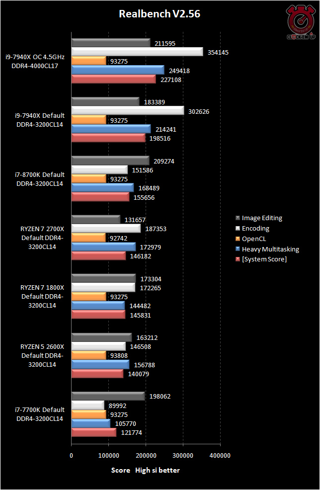มาดูกันต่อที่โปรแกรม Realbench V2.56 ซึ่งจากผลการทดสอบแล้ว พบว่าคะแนนรวมเอาจริงๆ แล้วทาง Intel Core i7-8700K นั้นดูเหมือนจะได้เปรียบอยู่มิใช้มะน้อยเลย เมื่อเอามาเทียบกับ 2700X และ 2600X แล้วเหมือกับว่างานด้าน Image Edit นั้นทาง 8700K นั้นได้เปรียบอย่างมากครับ คะแนนรวมๆ เลยออกมาดีกว่า แต่ถ้ามองที่คะแนนในส่วนของ Encoding นั้น 2700X ก็จะทำได้เหนือชั้นกว่าทันที เพราะมีจำนวน Threads มากกว่านั่นเอง ส่วนเจ้า 2600X นั้นก็ยังคงมี Scale ที่ไล่ๆ กับ 8700K อยู่เหมือนเดิมครับ