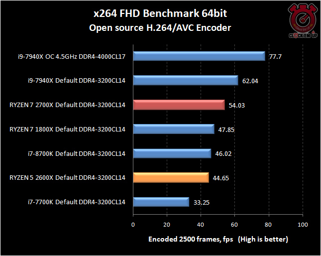 ต่อกันที่ x264 FHD Benchmark นั้นเจ้า 2700X นั้นทำผลงานได้น่าสนใจมากกับเฟรมเรทในการ Encode ได้ในระดับ 54.03fps กันเลยทีเดียว ส่วน 2600X ก็ยังตามหลัง 8700K อยู่ระดับหนึ่งเหมือนเดิมครับ…