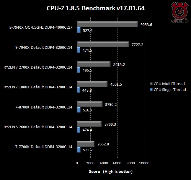 ในส่วนของโปรแกรม CPU-Z Benchmark นั้นเมื่อเทียบกันระหว่าง RYZEN 7 2700X และ RYZEN 7 1800X นั้นที่คะแนน Multi-Thread นั้นเห็นผลแบบชัดเจนเลยว่า 2700X นั้นทำคะแนนได้ดีกว่าในระดับ 5012.2 แต้ม ต่อคะแนน 4551.5 แต้มของ 1800X ส่วนของ RYZEN 5 2600X นั้นก็จะไล่ๆ กับ i7-8700K อยู่ระดับหนึ่งครับ ซึ่งห่างกันไม่มากนัก แต่ถ้าเทียบกับคะแนน Single Thread นั้นดูรวมๆ แล้วทาง Intel เหมือนประสิทธิภาพดีกว่า เนื่องด้วยสัญญาณนาฬิกาของ CPU นั้นมีสูงกว่าทาง AMD นั่นเอง