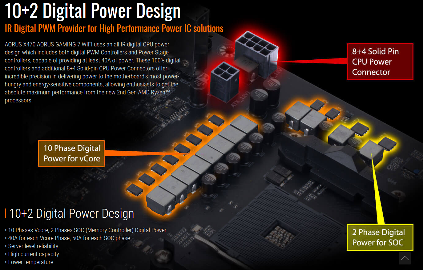 และที่ผมเห็นว่าน่าสนใจเลยคือค่ายนี้เลือกใช้ชุดภาคจ่ายไฟที่ค่อนข้างใหญ่จากค่าย IR Digital PWM และตัว Mosfet ซึ่งทำการแบ่งให้กับ CPU จำนวน 10+2Phase โดย 10 Phase แรกสำหรับ CPU โดยจ่ายได้ตัวละ 40A และอีก 2 Phase แยกให้กับชุด SOC โดยเฉพาะ ส่วนชุดจ่ายไฟ +12V Connectors นั้นมีมาให้แบบ 8+4 Pin อย่างละชุด สามารถรับ Load หนักๆ จาก CPU AMD RYZEN Gen2 ได้สบายๆ ครับ