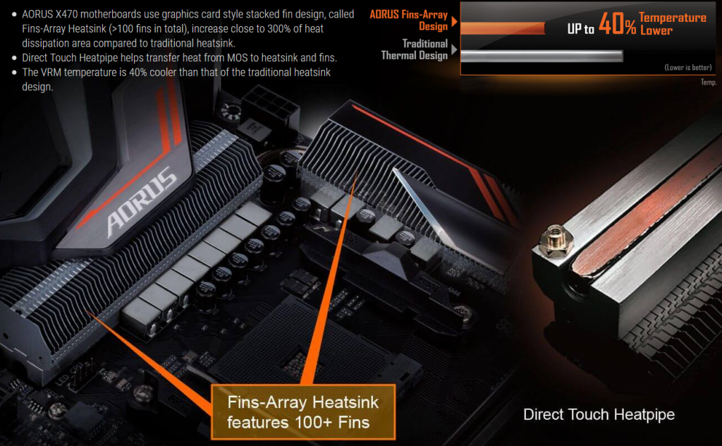 ในส่วนของ Heatsink ระบายความร้อนภาคจ่ายไฟนั้นทาง GIGABYTE ดูให้ความสนใจอย่างเป็นพิเศษสำหรับ CPU AMD RYZEN Gen2 เพราะอย่างที่เราทราบกันอยู่แล้ว ถึงจะลดกระบวนการ CPU ลงมาเหลือแค่ 12nm. แต่เอาเข้าจริงๆ เวลาใช้งานภาคจ่ายไฟก็ยังดูร้อนๆ อยู่ดีครับ ไม่ว่าคุณจะ OC หรือใช้งานแบบเดิมๆ ก็ตามแต่ โดยเฉพาะ CPU แบบ 8C/16T ในรุ่น 2700X/2700 แล้วนั้น หากมีการ Overclock CPU ในระดับ 4.3Ghz+ แล้วนั้นจำเป็นต้องดูแลภาคจ่ายให้ดี  ดังนั้น GIGABYTE จึงออกแบบการระบายความร้อนให้แก่ Mosfet ทั้ง 10+2 Phase นี้ด้วยระดบบ Direct Touch Heatpipe หรือการใช้ท่อ Heatpipe ทองแดงสัมผัสกับตัว Mosfet โดยตรง และดึงขึ้นมาระบายความร้อนยังชุด Fins อลูมิเนียมด้านบนที่ประกอบไปด้วยครีบกว่า 100 ชิ้นกันเลยทีเดียว โดยทาง GIGABYTE ให้ข้อมูลว่าการออกแบบเช่นนี้ ช่วยระบายความร้อนให้กับตัว Mosfet เมื่อเทียบกับ Heatsink ระบายความร้อนแบบทั่วไปที่ไม่ใช่ระบบ Direct Touch Heatpipe ได้ดีกว่าถึง 40% กันเลยทีเดียวครับ หุหุ…