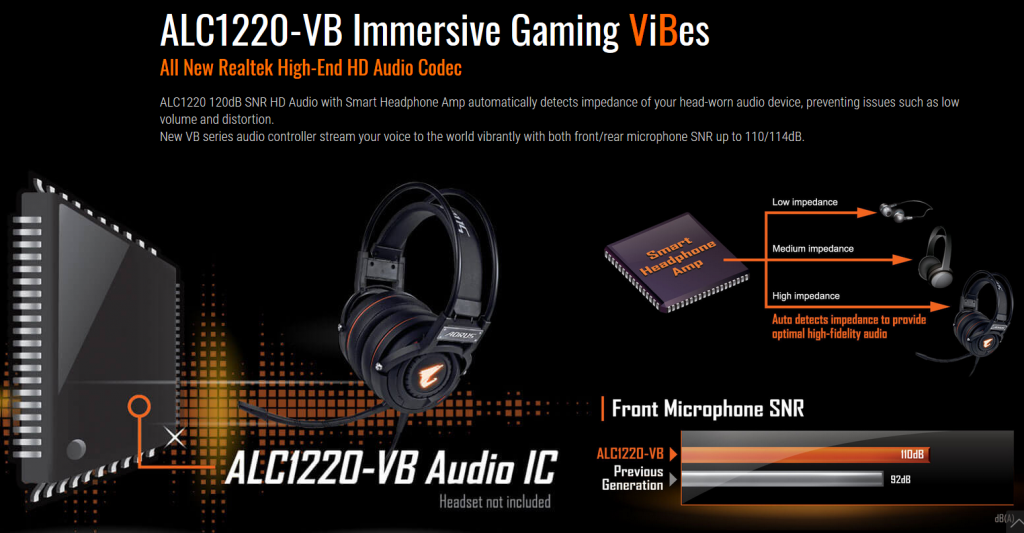 ระบบเสียงจัดเต็มด้วยขุมพลังชิป Realtek ALC1220-VB Codec (120dB SNR HD Audio) IC รุ่นใหม่ที่ฉลาดขึ้นในการ Detect หา Headset Gaming ที่มีค่า Impedance ที่ต่างกันได้แบบอัตโนมัติ และระบบกันอัดเสียงก็มีคุณภาพในระดับ 110dB/114dB SNR กันเลยทีเดียว