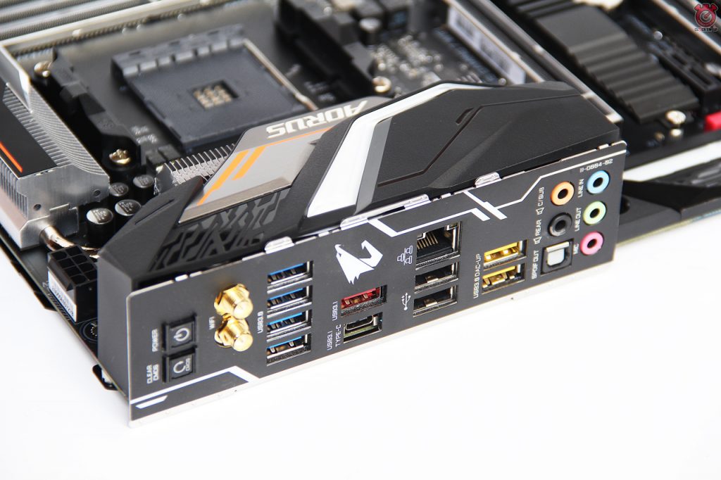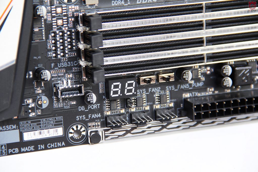 บริเวณจุดแสดง Debug Post, USB3.1 Type-C Panel และ Swirtch สำหรับคุม BIOS ทั้ง 2 ตัว พร้อมทั้งแถบ Swappable Overlay for Accent LED ที่สามารถถอดเปลี่ยนได้