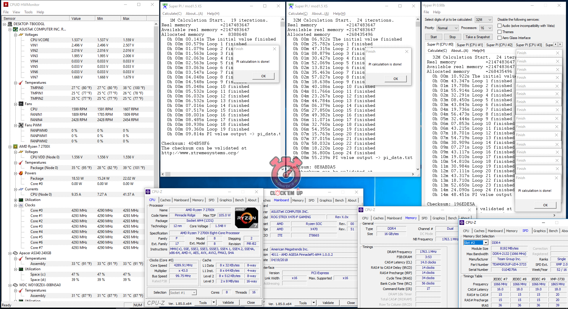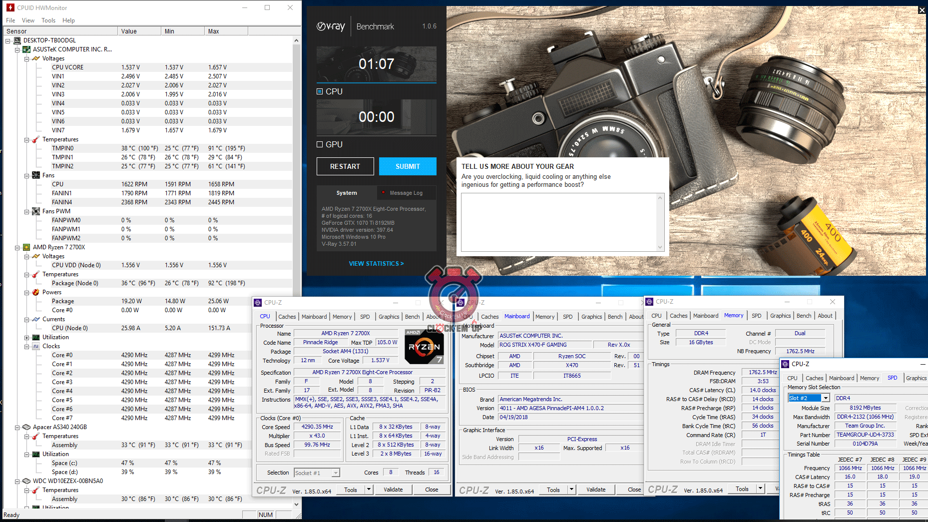 ก็เรียบร้อยไปด้วยดีสำหรับ Benchmark ต่างๆ กับค่าการ Overclock Config ของ CPU AMD RYZEN 7 2700X 8C/16T ที่สามารถ Overclock ได้ในความเร็วระดับ 4.3Ghz แบบไม่มีตัวคูณแบบ Drop เลยแม้แต่คอร์เดียว แสดงให้เห็นแบบชัดเจนเลยว่า สถาปัตยกรรม Zen+ 12nm. [Pinnacle Ridge] นั้นสามารถดันให้ RYZEN 7 2700X วิ่งเกินความเร็วในระดับ 4Ghz+ ได้แบบชิวๆ จริงๆ ครับ ซึ่งก่อนหน้านี้กับเจ้า RYZEN 7 1800X นั้น 4Ghz นิ่งๆ ได้นี่ก็หรูแล้ว ดังนั้นใครอยากเล่น RYZEN ในระดับ 4.2Ghz+ ทุกๆ คอร์แบบนิ่มๆ แนะนำย้ายมาเล่นบน Zen+ กันเลยครัช….. ไม่ผิดหวังแน่นอน ส่วนเรื่องการดันแรมนั้นก็ดีขึ้นมาอีกระดับหนึ่ง กล่าวคือ จากเมื่อก่อนมากจะ OC แรมได้กันแถวๆ 2933Mhz ถึง 3200Mhz กันเป็นเสียส่วนใหญ่ แต่สำหรับ Zen+ 12nm นั้นปรับปรุงมาให้ดีขึ้นอีกระดับหนึ่งเลยทีเดียว คือเล่นง่ายขึ้นในระดับ 3400Mhz ถึง 3600Mhz+ ส่วนที่ผมแนะนำเลยก็คือการเล่นแรมแถวๆ DDR4-3466Mhz นั้นทำได้ง่ายมากอย่างเห็นได้ชัดเจน และในส่วนของความเร็วแรมระดับ 3533Mhz+ ต้องหาแรม DDR4 ชิป Samsung B-Die ดีๆ สักคู่หนึ่ง ถึงจะไปได้ง่ายขึ้นครับ….