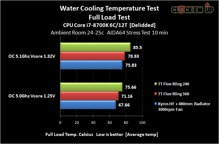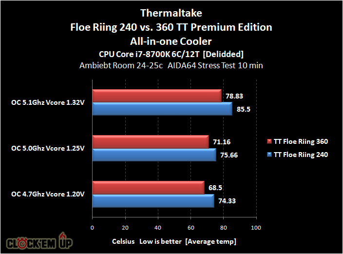 ผลการทดสอบแรกนั้นเราจะเทียบกันระหว่างชุดน้ำทั้ง 2 รุ่นใน Series เดียวกัน ซึ่งได้แก่ Tt Floe Riing 240 และ 360 ที่ทดสอบบนชุด System เดียวกันคือ Intel Core i7-8700K ตั้งแต่ความเร็ว 4.7Ghz, 5.0Ghz และ 5.1Ghz ซึ่งผลการทดสอบทั้งหมดนั้นตัวชุดน้ำรุ่นใหญ่อย่าง Floe Riing 360 นั้นระบายความร้อนได้ดีกว่าในระดับ 4.5c ถึง 6.6c องศาเซลเซียส กันเลยทีเดียว ดังนั้นก็ยังมองเห็นความแตกต่างกันแบบชัดเจนของชุดน้ำ 2 ตอนและ 3 ตอนครับ…