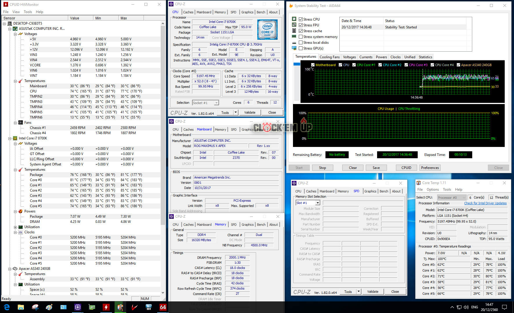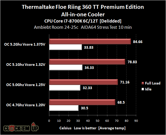 ส่วนตรงนี้คือผลการทดสอบอีกชุดหนึ่งที่ผมทำการทดสอบเรื่องอุณหภูมิด้วยการ Overclock CPU Intel Core i7-8700K ที่ความเร็วต่างๆ ซึ่งที่ประทับใจเลยก็คือ Floe Riing 360 รุ่นนี้สามารถ Burn In ได้เกิน 10 นาทีที่ความเร็วกว่า 5.2Ghz กันเลยทีเดียวครับ ซึ่งเกินความคาดหมายของผมอย่างมาก….