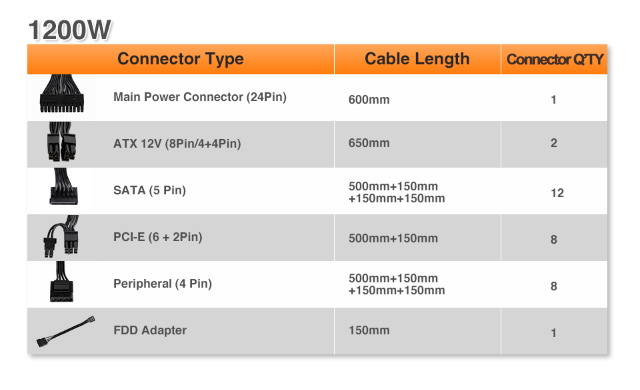 PSU ลูกนี้มีตัวถังสีดำล้วนทั้งตัวและความยาวสูงสุด 180mm. จัดว่าเป็น PSU ที่ไม่ยาวมากนักเมื่อเทียบกับขนาดความจุ 1200Watt ซึ่งเมื่อเทียบกับ PSU บางรุ่นนั้นอาจจะยาวกว่า 200mm. กันเลยทีเดียว ดังนั้นเวลาติดตั้งใน Case ที่ไม่ใหญ่มาก ควรพิจารณาขนาดความยาวของ PSU ดูกันด้วยครับ จะได้ไม่ติดอะไรใน Case ดังนั้น PSU รุ่นนี้เมื่อเทียบขนาดความยาวกับกำลังวัตต์ที่จ่ายได้แล้วถือว่าเป็น PSU ที่กะทัดรัดมาก และสำหรับมาตรฐานการออกแบบชุดไฟเลี้ยง +12V ของ PSU รุ่นนี้คือ ATX 12V v2.4 และ EPS v2.92