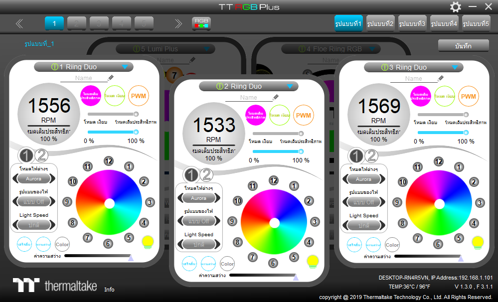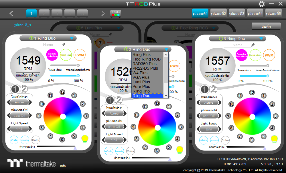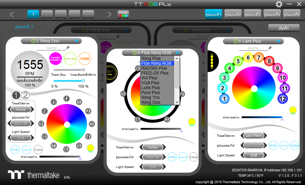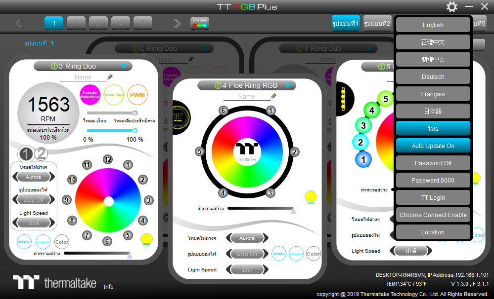 สำหรับโปรแกรม TT RGB PLUS Software นั้นก็จะรองรับการปรับเป็นภาษาไทยได้แล้วนะครับ ถือว่าเยี่ยมไปเลย ส่วนหน้าตาของ UI นั้นก็ยังคงเหมือนเดิม โดยจะมีหน้าแยกปรับพัดลม หรือตัวปั้มน้ำ แยกกันเป็นชุดๆ