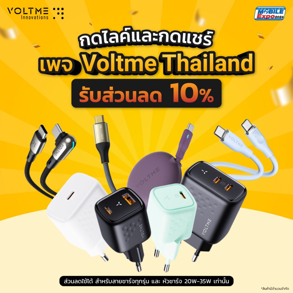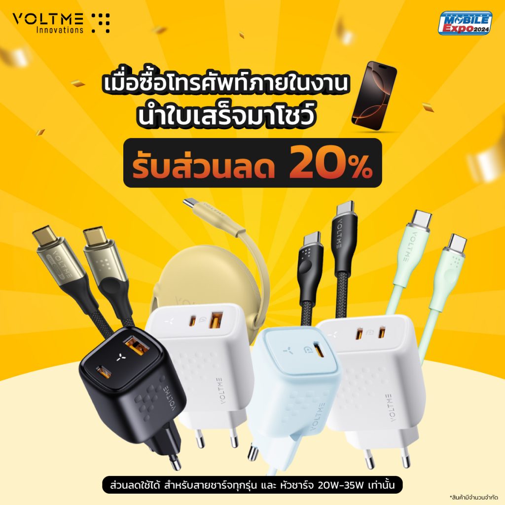 หากคุณเป็นหนึ่งในผู้ที่ซื้อสมาร์ทโฟนใหม่ในงาน Thailand Mobile Expo 2024 นี้ อย่าลืมนำใบเสร็จมาแสดงรับสิทธิ์ที่บูธ VOLTME รับส่วนลดทันที 20%* เพื่อเพิ่มประสิทธิภาพการชาร์จให้กับสมาร์ทโฟนเครื่องใหม่ของคุณ