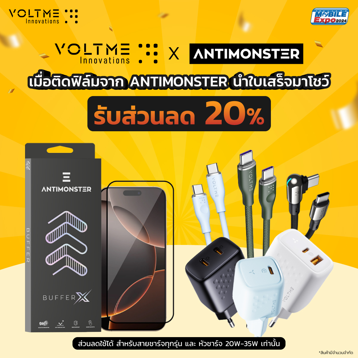 เมื่อลูกค้าติดฟิล์มนิรภัยจากบูธ ANTIMONSTER เสร็จแล้ว นำใบเสร็จมาโชว์ที่บูธ รับส่วนลดพิเศษ 20%* ซื้อครบจบในงานเดียว ได้ทั้งโทรศัพท์ใหม่ ฟิล์มนิรภัยที่อุ่นใจ และได้ที่ชาร์จคุณภาพสูงกลับบ้านครบมือ ทั้งนี้ ทุก ๆ ใบเสร็จของ VOLTME ยังเป็นส่วนลดพิเศษสูงสุด 25% สำหรับติดฟิล์ม ANTIMONSTER ด้วยเช่นกัน