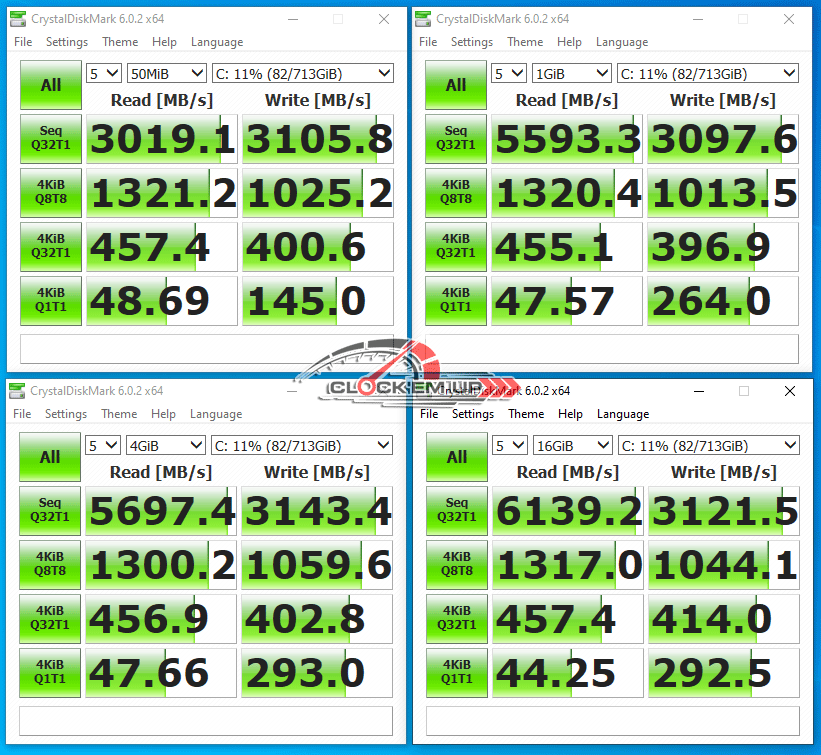 และสำหรับ CrystalDiskMark นั้้นก็มีผลการทดสอบที่ค่อนข้างออกมาดูดีกว่า AS SSD อยู่นิดหนึ่งครับ อย่างน้อยก็เห็นความเร็ว Seq Read/Write @ 6139/3121MB/s ที่ขนาดไฟล์ทดสอบ 16GB
